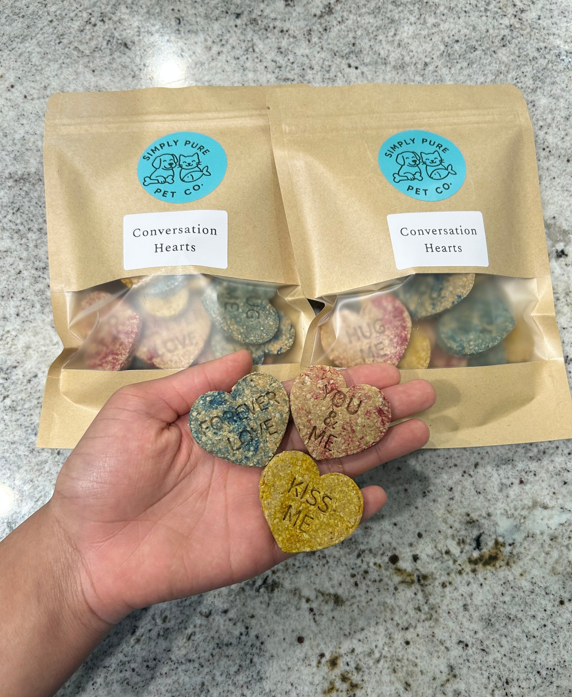 - Show your pup just how much they mean to you with our Peanut Butter & Applesauce Conversation Heart Treats! Each crunchy heart is baked with simple all-natural ingredients and naturally colored with immune-supporting fruits and veggies — no artificial dyes ever. Stamped with sweet sayings and packed with real peanut butter, they’re perfect for rewards, or a everyday sweet treat!
