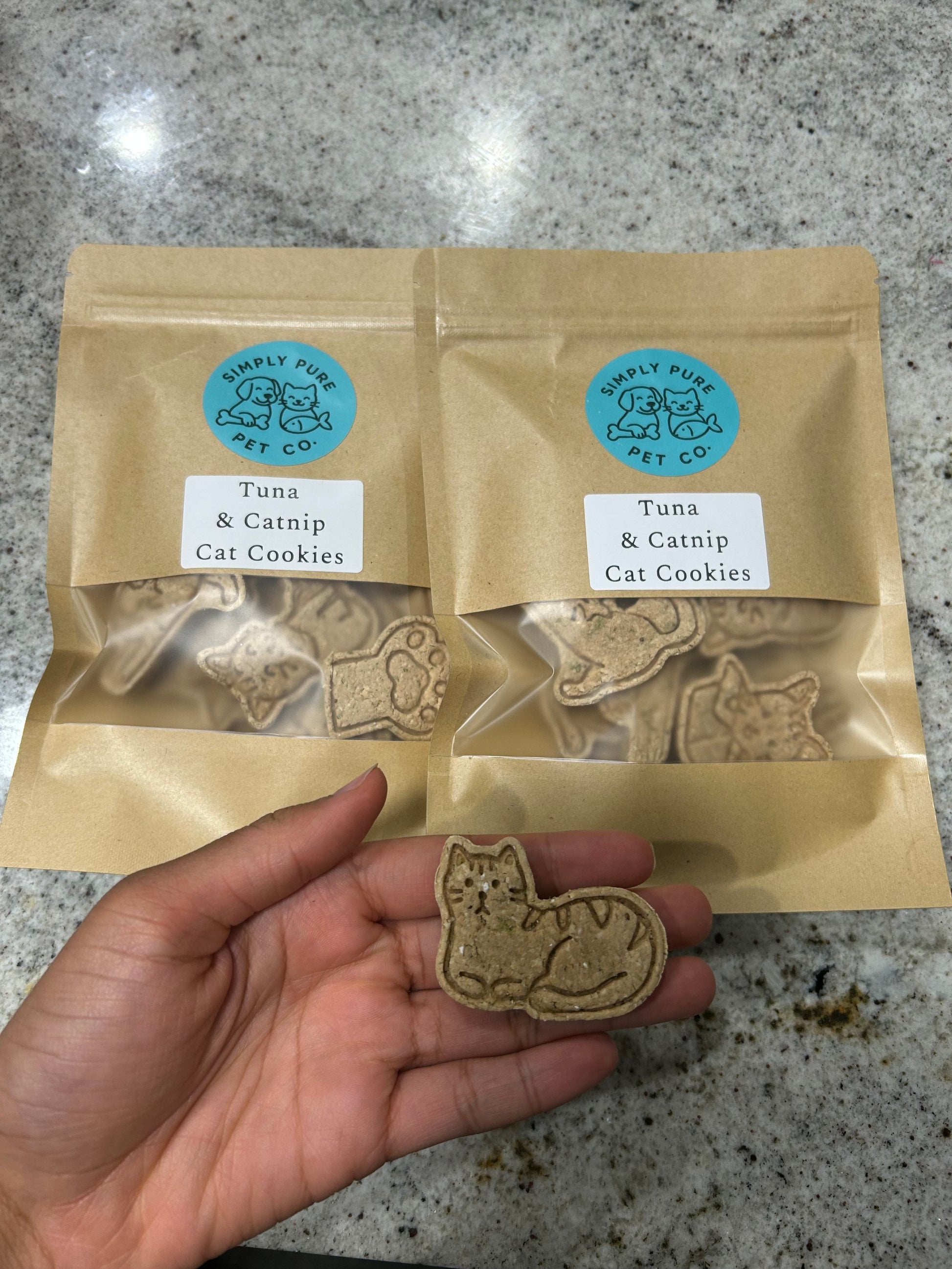 - Cat cookies baked with organic oats, real tuna, and a sprinkle of catnip, these all-natural cookies are a purr-fect mix of crunchy and tasty. Each bag comes with a fun assortment of shapes of cats to keep treat time exciting. Ideal for rewarding, spoiling, or just showing your kitty a little extra love.